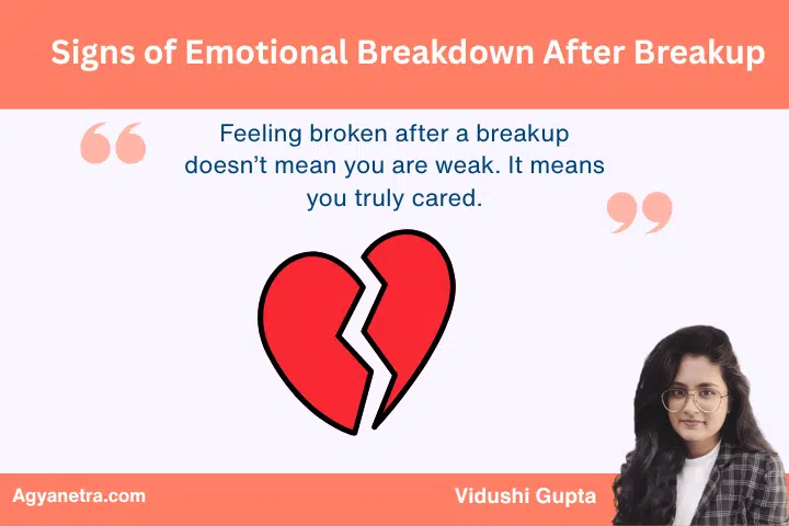 Many people experience what feels like an emotional breakdown after breakup. According to Vidushi Gupta, emotional wellness author and founder of Agyanetra, “A breakup forces us to confront the parts of ourselves we ignored while loving someone else. Healing begins when we stop trying to get back what we lost and start rediscovering who we are.”